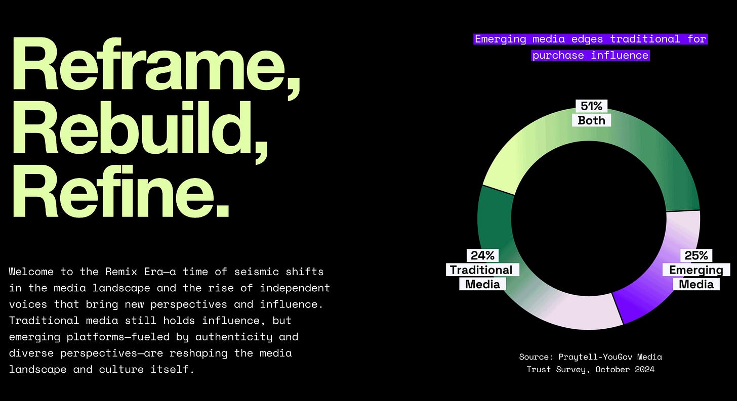 Communications agency Praytell recently partnered with YouGov to publish The Remix Era, a whitepaper all about the rise and growing impact of emerging media, defined as digital-born and digital-first platforms like social channels, podcasts, and newsletters as opposed to traditional, legacy outlets like The Wall Street Journal and CNN. The report surveyed 1,300 consumers about their relationship to media, digging into preferences around traditional media versus emerging media.